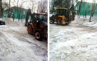 Пока снег снова не нападал, рассказываем. Как и обещали, начало этой недели мы посвятили уборке дворов от снега и снежной каши. С участием спецтехники, конечно. Без трактора мы бы не справились привести в порядок 29 дворов всего за пару дней.