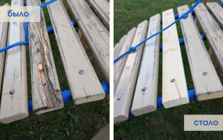Мы заменили прогнившие бруски. Установили на их место новые. Можно залазить по веревочной лестнице и даже прыгать на настиле. Доски точно выдержат.