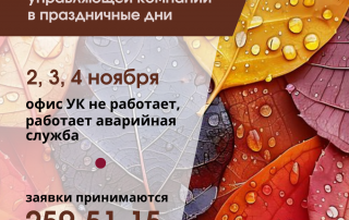 2,3,4 ноября – выходные дни. Но аварийная служба будет работать круглосуточно. С 5 ноября управляющая компания начнет работать в прежнем режиме.